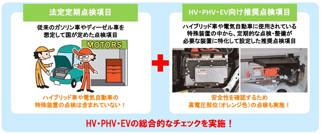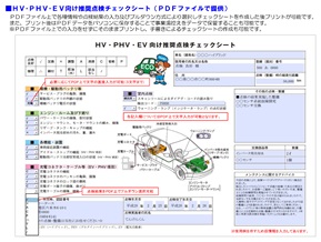 近年増加傾向にあるハイブリッド車及び電気自動車等は、法定定期点検項目に設定されていない特殊装置が多く用いられており、その性能の維持や安全性を確保するためには他の一般的な装置と同様に定期的な点検・整備が必要不可欠であります。当該HV・PHV・EV向け推奨点検は、ハイブリッド車及び電気自動車の特殊装置に関して、幅広い車種に対応可能な点検メニューとして設定したものとなりますので、法定定期点検時などにおける追加サービスメニューとしてお役立ていただければ幸いです。 なお、当該点検の実施には自動車ユーザーの理解を得ることが必要不可欠であり、そのためにはサービスメニュー提案時の点検の必要性の説明とともに、点検結果を分かりやすい形で提示することが重要であることから、自動車ユーザー向けの点検結果提示・説明に活用可能なチェックシートをご用意しましたのでご活用ください。 HV:ハイブリッド PHV:プラグインハイブリッド EV:電気自動車 ![]() |