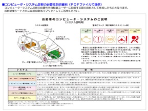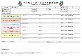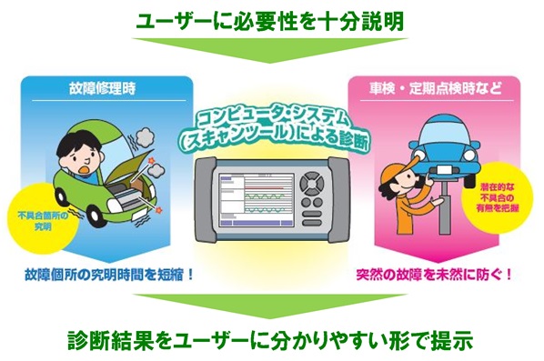 ![]() 近年の車両は、低燃費性能の追求や交通事故回避等のため、電子装置を多用して制御しており、スキャンツールを使用しなければ正確な状態を把握することが困難な装置が増加しております。スキャンツールによる診断は、不具合の早期発見の観点からも、故障修理時のみではなく定期点検時等に継続的に実施することが好ましいと思われますが、整備事業場において診断を実施する場合は、その必要性を自動車ユーザーに十分説明するとともに、診断結果を分かりやすい形で提示することが重要であります。 コンピュータ・システム診断結果シートは、診断内容及び結果を分かりやすく提示するためのツールとしてご用意したものとなりますので、自動車ユーザーへの説明等にご活用ください。 ![]() ■ コンピュータ・システム診断結果シート 記入例 ■ コンピュータ・システム診断の必要性説明資料 ![]() 画像をクリックするとPDF版をご覧になれます 画像をクリックするとPDF版をご覧になれます ■ コンピュータ・システム診断結果シート (お客様向け説明資料付き) ![]() 診断結果シートダウンロード (PDF版) (Excel 版) |